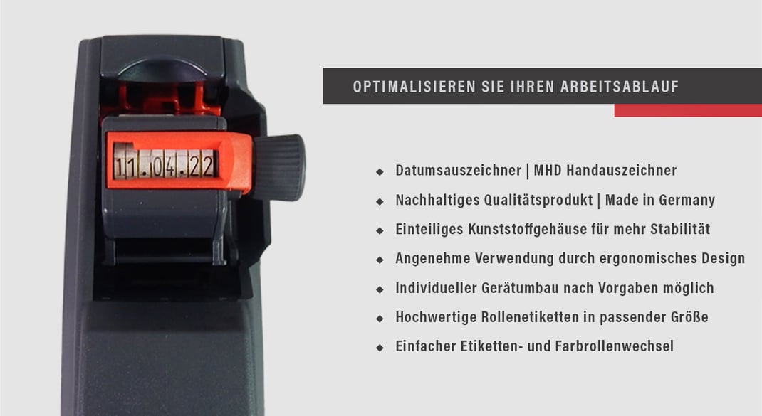 Das Mindesthaltbarkeitsdatum (MHD) gilt als vorgeschriebenes Kennzeichnungselement bei verderblichen Produkten. Sicher möchten auch Sie den Anforderungen des EU-Rechts entsprechen und Ihre Artikel mit dem Mindesthaltbarkeitsdatum richtig kennzeichnen. Neben der Verwendung zur MHD-Kennzeichnung können unsere Handauszeicher natürlich auch für alle anderen datumsspezifischen Anwendungen genutzt werden (wie z.B. das Herstellungsdatum, Ablaufdatum, Verpackungsdatum, Einfrierdatum, Verfallsdatum und vieles mehr).