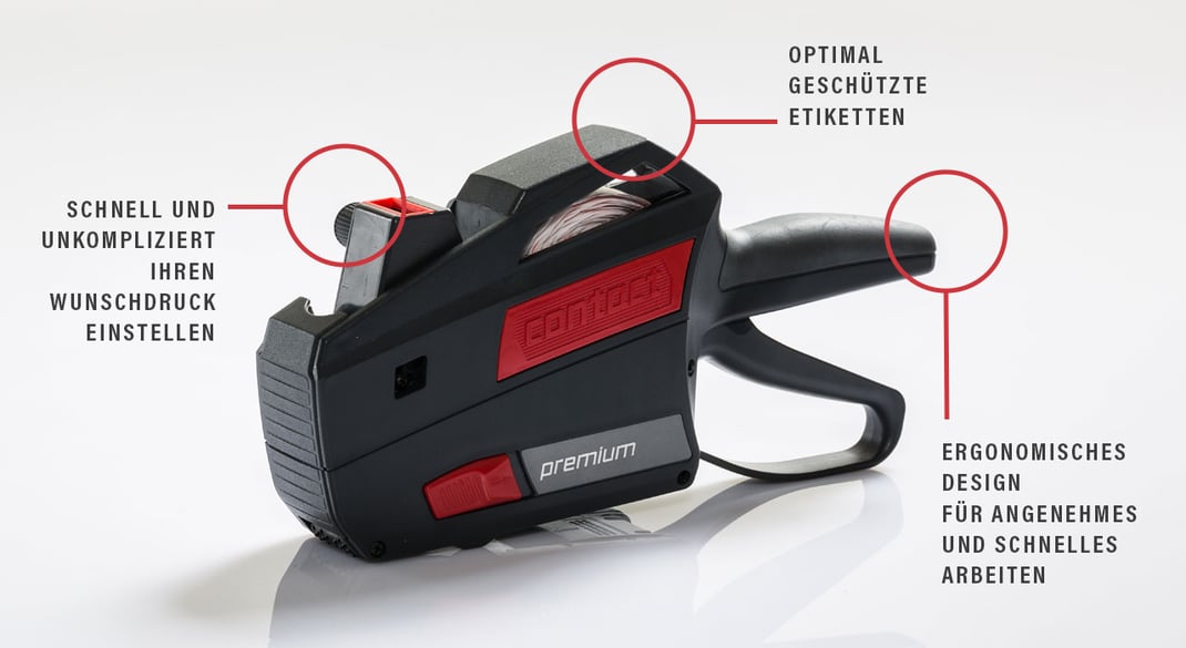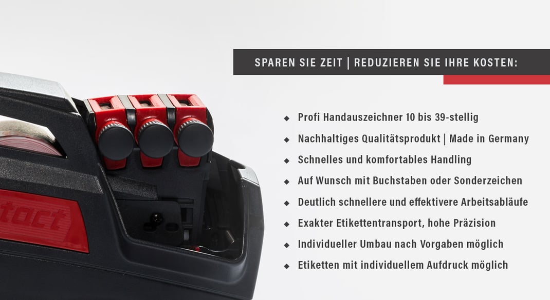 Unsere Contact PREMIUM-Serie bietet Ihnen ergonomisch gestaltete Handauszeichner für das mobile und rechtskonforme Etikettieren in bester Qualität. In allen Bereichen der professionellen Produktkennzeichnung sind schnelle und präzise Auszeichnungen von hoher Notwendigkeit. Mit unserem Preisauszeichner Artikelnummer können Sie Ihre Produkte schnell und flexibel mit Lotnummer, Chargennummer oder Losnummer kennzeichnen. Dank der robusten Verarbeitung und ergonomischen Form liegt der Handauszeichner für Chargennummer optimal in der Hand und sorgt für ein schnelles und effizientes Arbeiten.