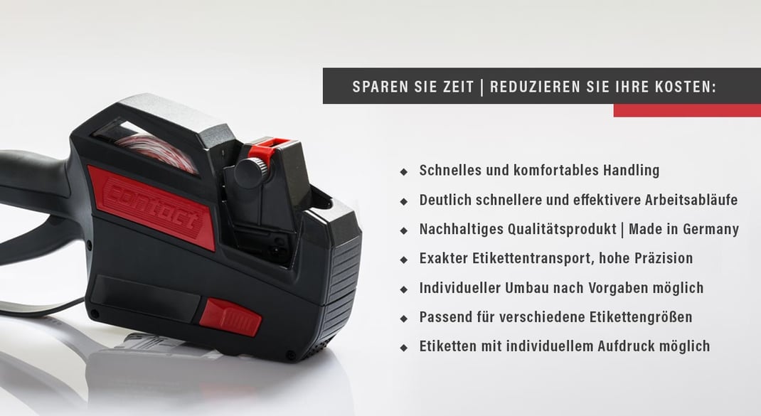 Preisauszeichnungsgeräte sind elementare Hilfsmittel zur Auszeichnung und gehören zum täglichen Bedarf im Einzelhandel, Industrie und Lagerhaltung. Deshalb ist hier die Qualität umso wichtiger. Wir haben bereits viele Unternehmen aus verschiedenen Branchen mit unseren bewährten Preisauszeichnern überzeugt. Dank der Contact Handauszeichner lassen sich Produkte flott, effizient und zuverlässig etikettieren, wobei die ergonomische Form des Auszeichners die Handgelenke entlastet. Lassen Sie sich begeistern, denn die Vorteile der Handauszeichner & Preisauszeichner werden auch Sie garantiert überzeugen!